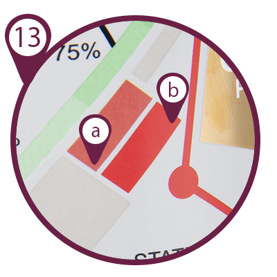 Porównanie kolorów osiągniętych metodą druku CMYK (a) oraz według Pantone (b):